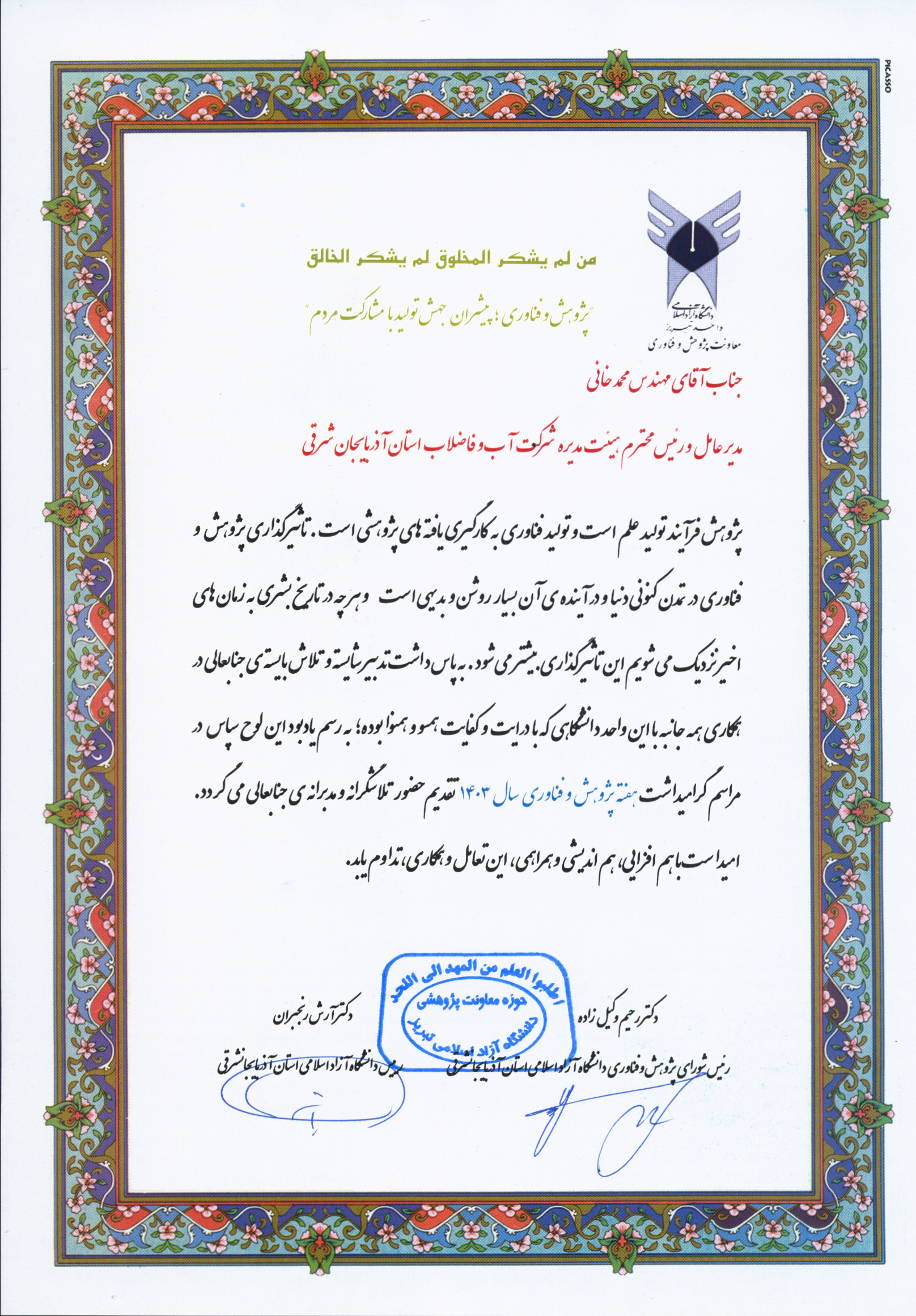 | دریافت تندیس و لوح تقدیر از دبیر محترم منطقه ویژه علم و فناوری ربع رشیدی و رئیس ستاد اجرائی نمایشگاه RINOTEX2020 به جهت حمایت و همکاری در برگزاری هشتمین نمایشگاه نوآوری و فناوری های ربع رشیدی | تقدیر ریاست محترم دانشگاه شهید مدنی آذربایجان از مدیر عامل محترم و مجموعه شرکت آب و فاضلاب استان به عنوان حامیان پژوهش و فناوری و پیشگامان ارتباط صنعت با دانشگاه | تقدیر ریاست محترم دانشگاه آزاد اسلامی استان آذربایجان شرقی از مدیر عامل محترم و مجموعه شرکت آب و فاضلاب استان در راستای توجه به اصول علمی، ایجاد و بسط همکاری های پژوهشی