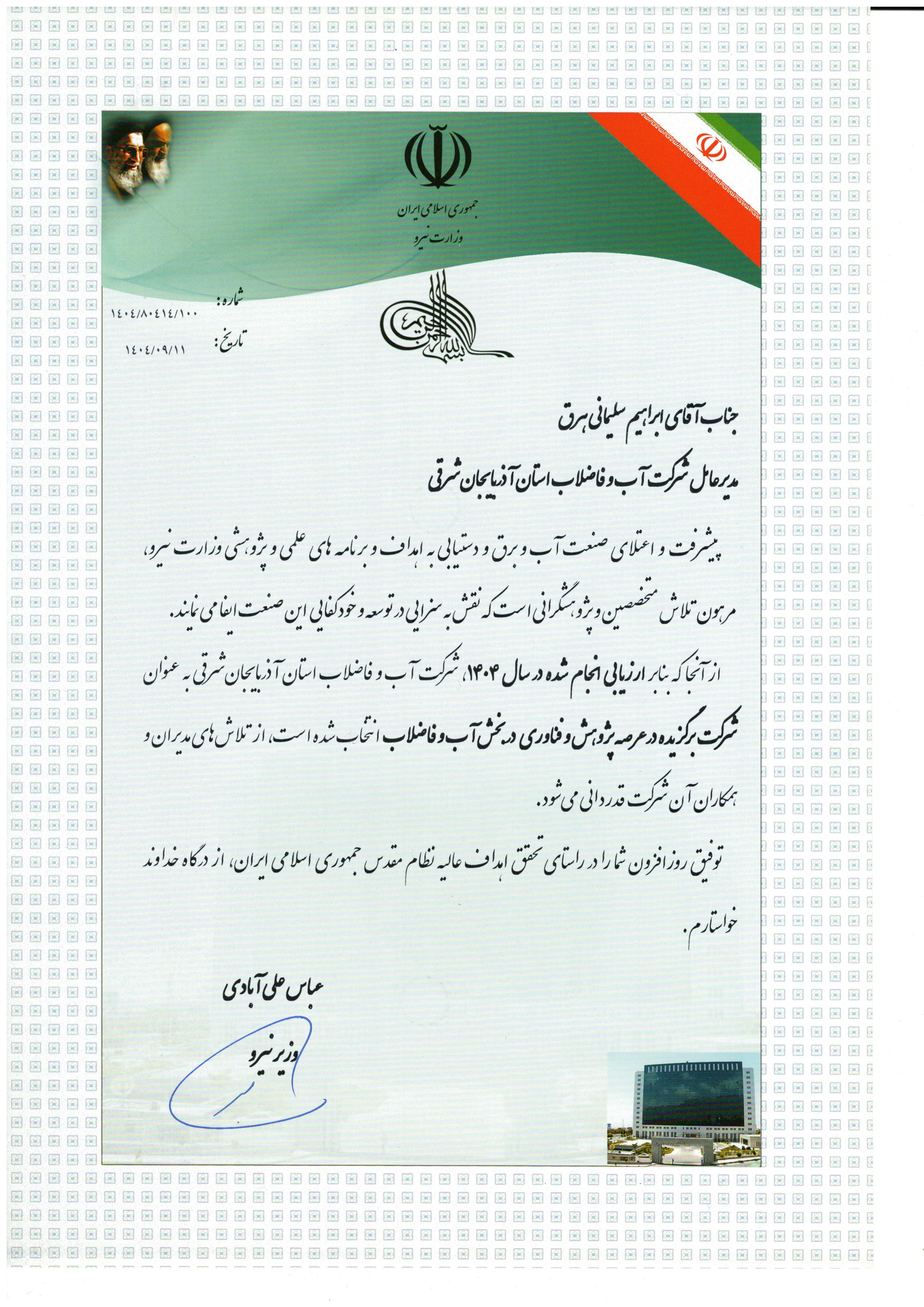 دریافت لوح تقدیراز مقام عالی وزارت نیرو به جهت کسب عنوان : « دستگاه برتر در مجموع امتیاز شاخص های عمومی و اختصاصی» سال 99